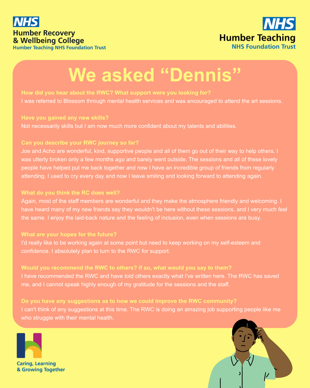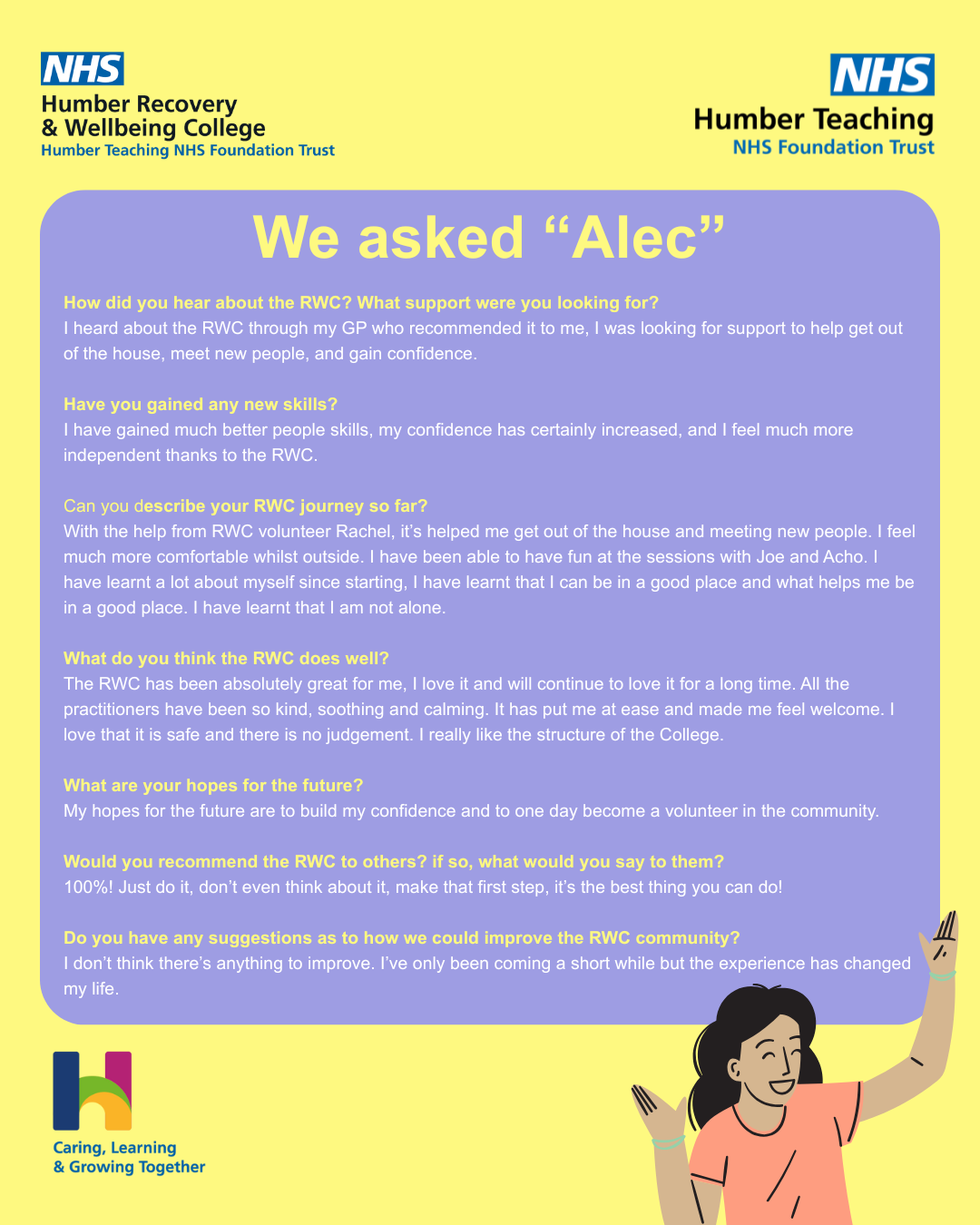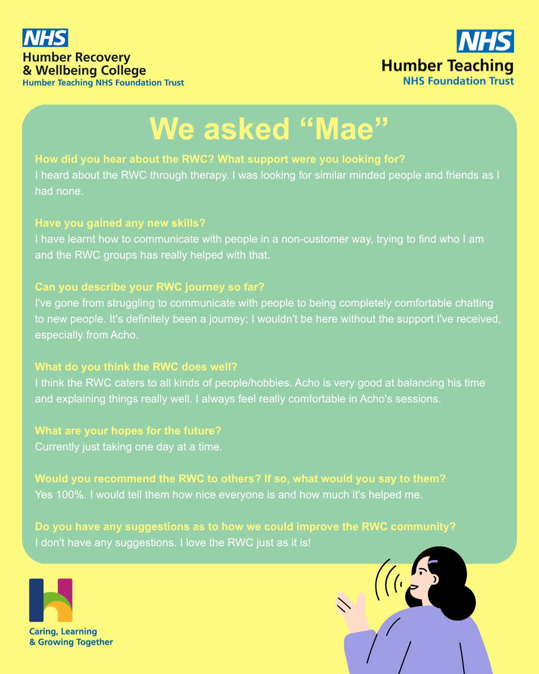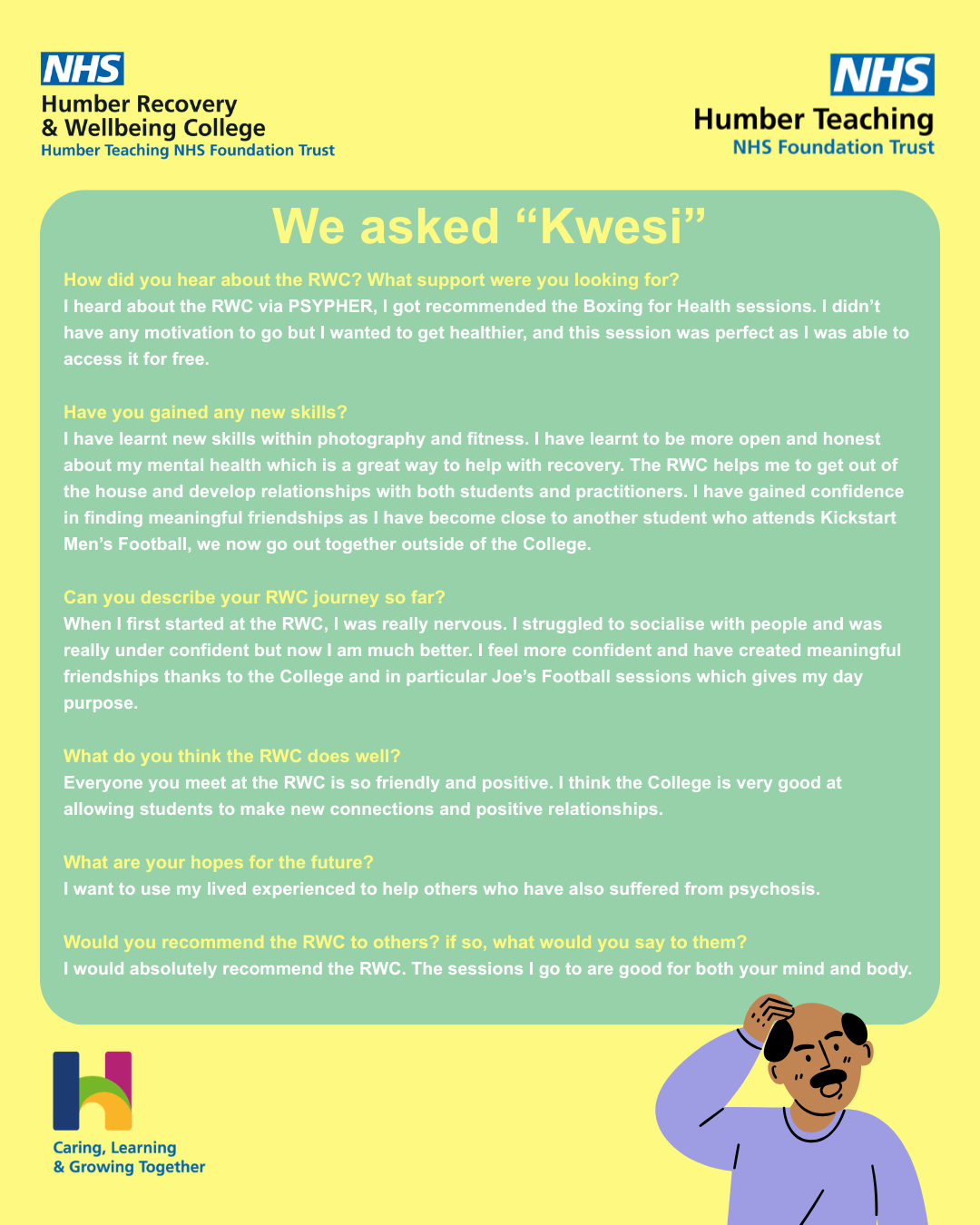 Our Student Stories share the real experiences of people currently studying with us at the Humber Recovery & Wellbeing College. We invite students to talk about their journey, what they have enjoyed, and how being part of the College has supported their wellbeing and recovery.